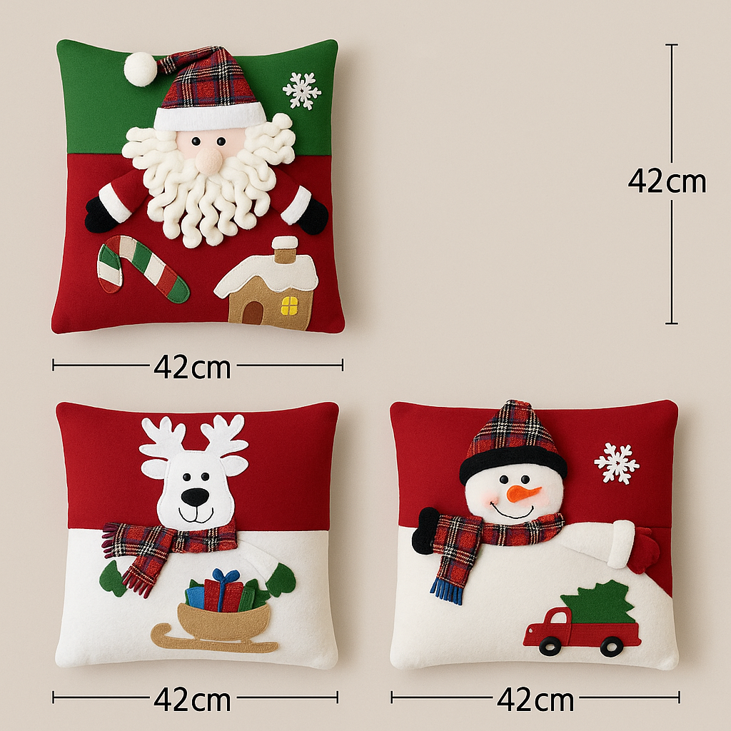 Capas de almofada natalícias com 42 cm, feitas em tecido macio e decoradas com aplicações em relevo de Pai Natal, Rena e Boneco de Neve. Cada modelo apresenta detalhes trabalhados como cachecóis em tecido, elementos festivos e cores tradicionais da época. Ideais para dar um toque acolhedor e temático à sala, ao quarto ou a qualquer espaço da casa durante o Natal. Fáceis de colocar e com acabamento de qualidade, são perfeitas para transformar o ambiente de forma imediata.