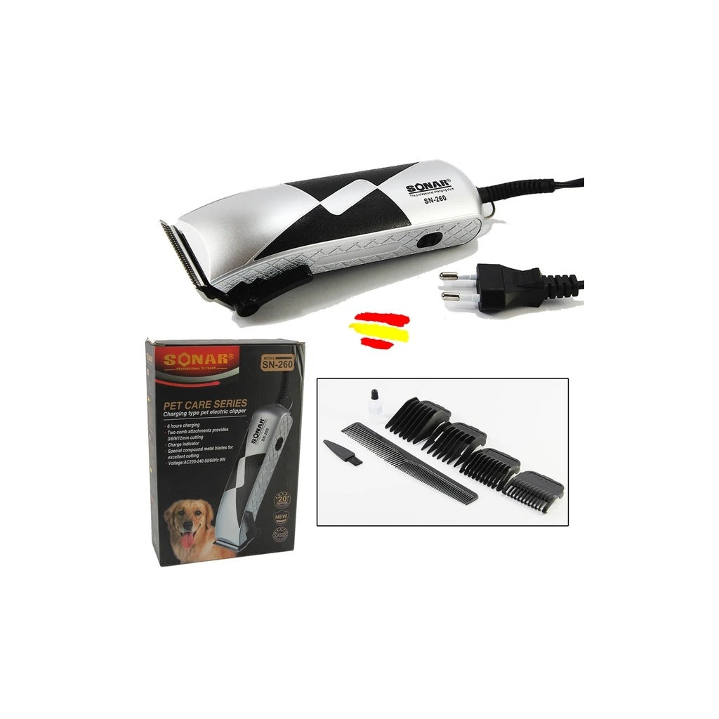 Máquina de Tosquia Sonar SN-260 para Animais de EstimaçãoCuide do seu animal de estimação com a Máquina de Tosquia Sonar SN-260, projetada para oferecer cortes precisos e confortáveis. Ideal para cães e gatos, este equipamento garante resultados profissionais em casa.Vantagens do Produto✅ Lâminas de aço inoxidável para cortes precisos e duradouros;✅ Design ergonómico para fácil manuseio;✅ Baixo ruído, ideal para animais sensíveis;✅ Ajuste de diferentes comprimentos com pentes de fixação incluídos;✅ Fácil limpeza e manutenção.CaracterísticasModelo: SN-260Tensão: 220-240V, 50/60HzPotência: 9WInclui: 4 pentes de fixação (3mm, 6mm, 9mm, 12mm), pente, escova de limpeza e óleo lubrificante